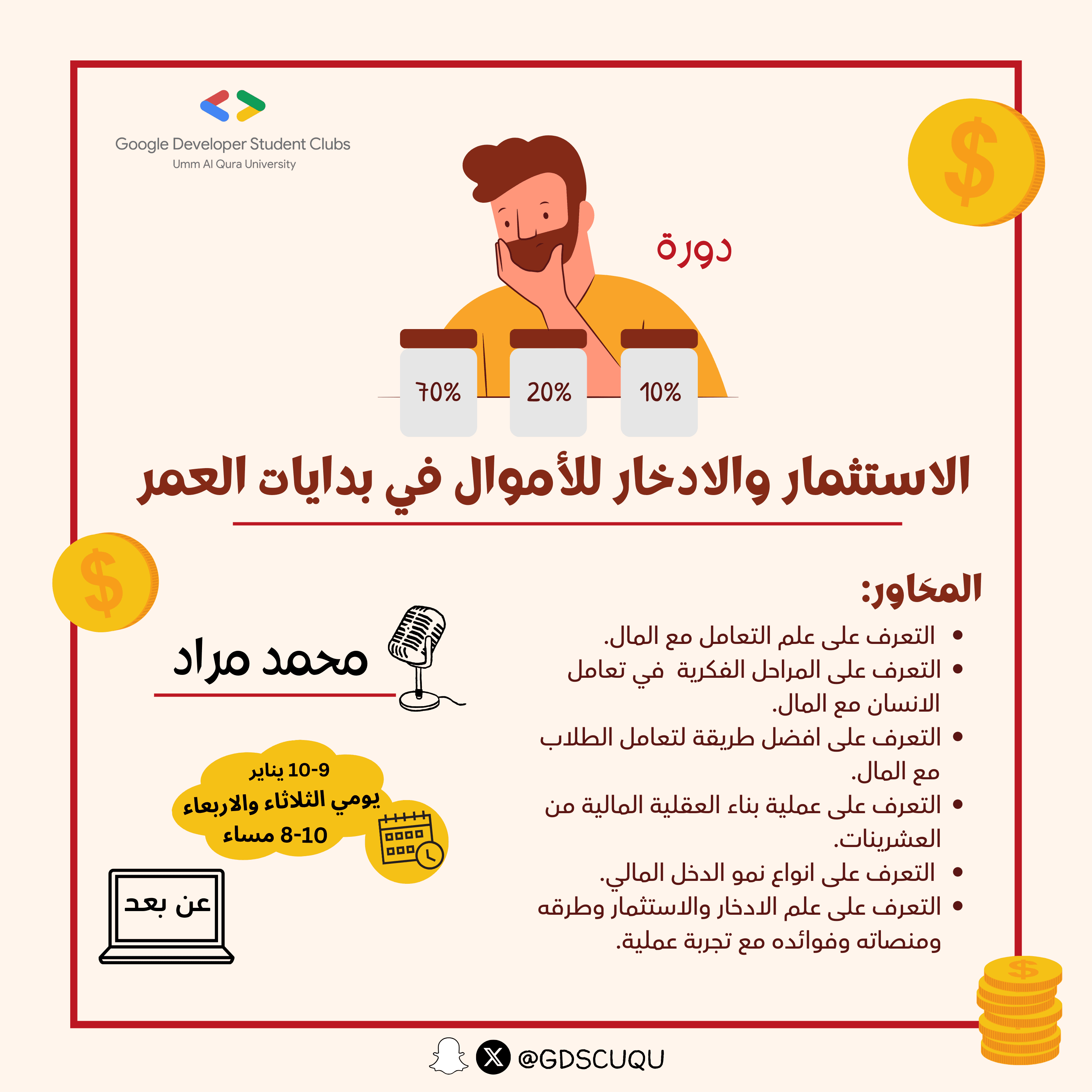 A simple and clear poster for a workshop on managing and saving money at a young age. It covers key topics like handling money, building good habits, and practical saving tips. The design is bright and easy to read.
